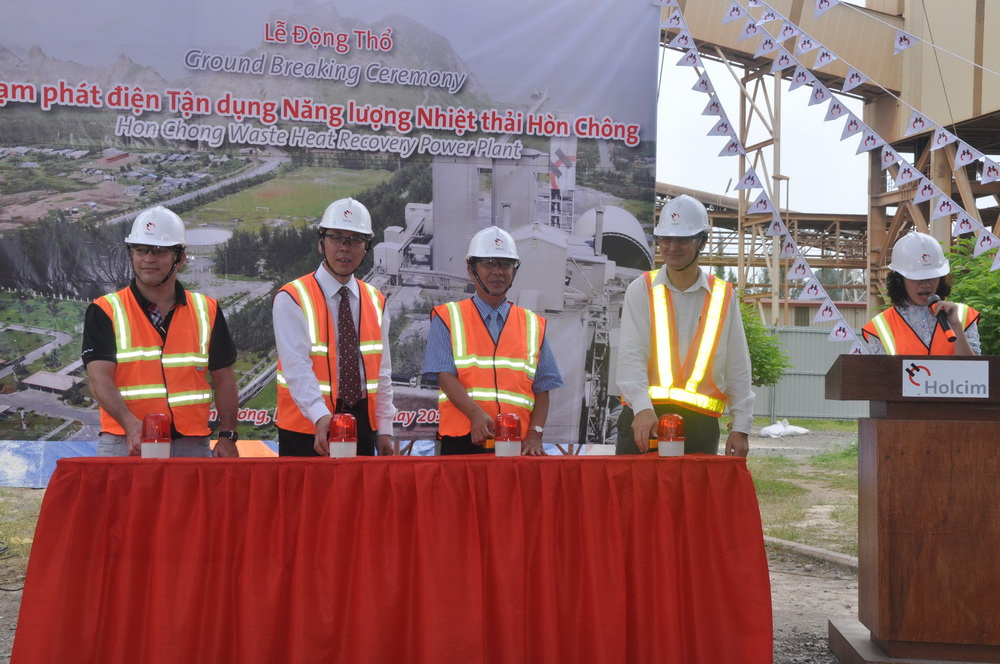 On 26th May, 2011, the EPC WHR project of Holcim Vietnam undertaken by Sinoma Energy conservation Ltd. held a groundbreaking ceremony in Hon Chong county, Kien Giang province, Vietnam. Mr. Nguy?n Tr?n Nam, the governor of Kien Giang province , Mr.Francois Goulut, the technical director of Vietnam Holcim, and Mr. Aridavid Lozano , the director of cement plant, together with Mr. Hu Yeming , the president of Sinoma-EC starts the button, which was once again cooperation with Holcim group afterwards Thailand SCCC 1000 t/d project.